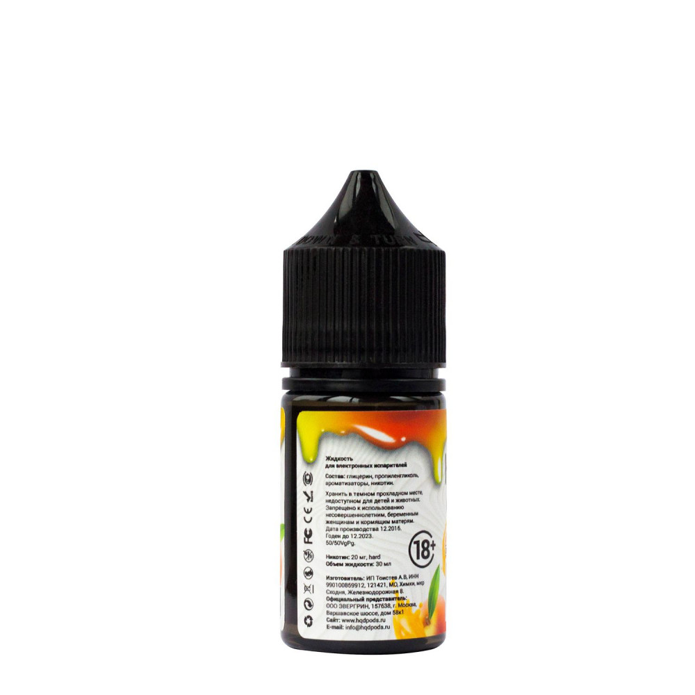 Жидкость HQD MIX IT Манго Персик - это уникальная солевая жидкость, разработанная специально для использования в электронных сигаретах. Она отличается от обычных жидкостей для заправки электронных сигарет своим составом, включающим солевой никотин. Благодаря этому, никотин быстрее всасывается в организм, обеспечивая более гладкое и эффективное удовлетворение потребности в никотине.